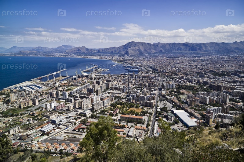 Италия, Сицилия, Палермо, панорамный вид города и порта с горы Пеллегрино