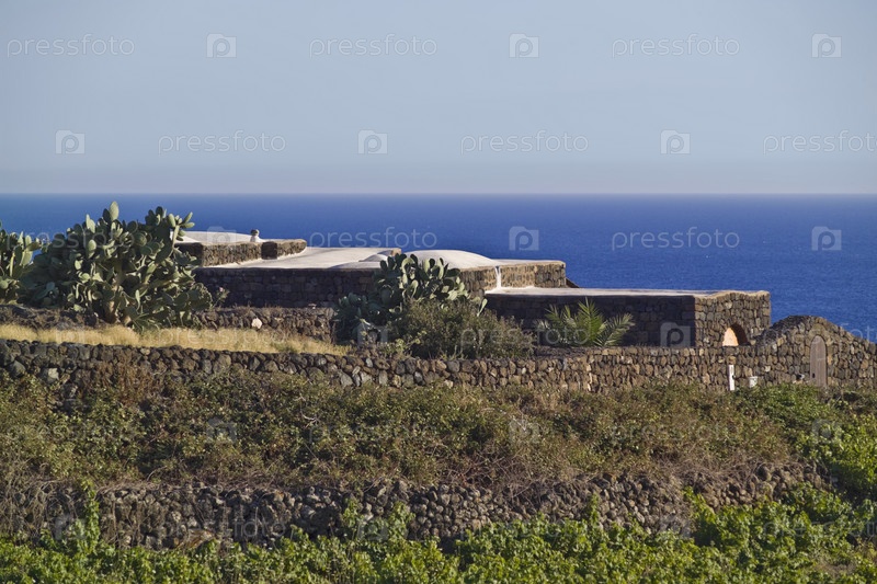 Италия, Сицилия, остров Пантеллерия, виноградники, опунции и крыша типичного местного каменного дома в арабском стиле