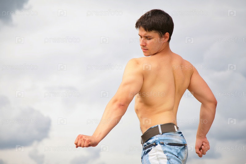 Молодой культурист на фоне облачного неба