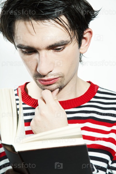 Молодой парень читает книгу на белом фоне