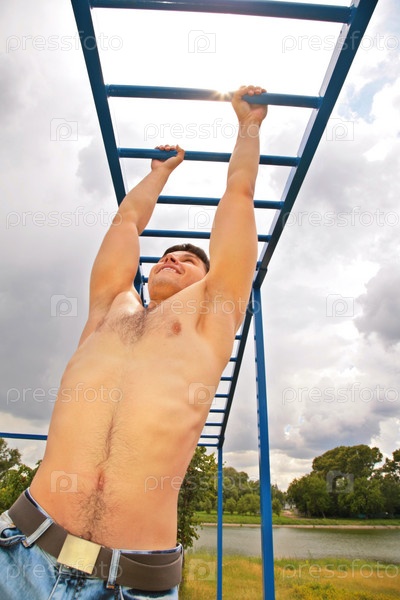 Молодой спортсмен тренируется на железной перекладине