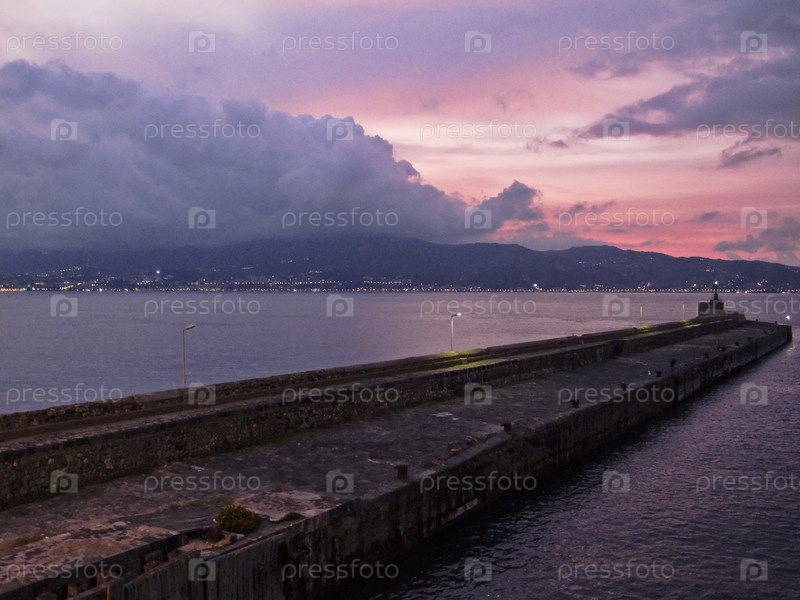 Италия, побережье Сицилии, Мессина и Сицилийский пролив из Калабрии на закате