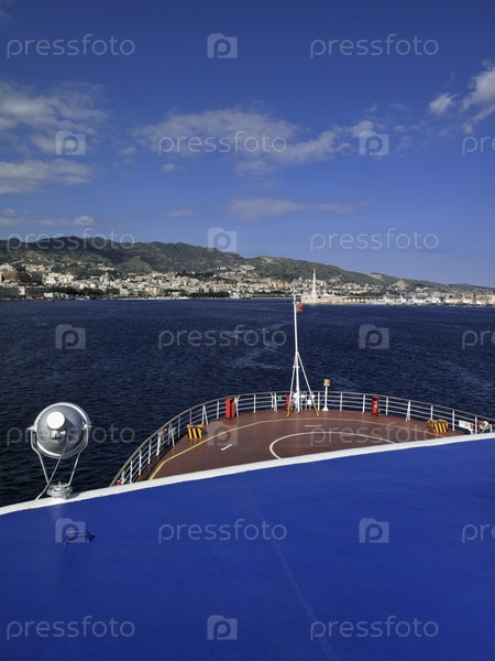 Италия, Сицилия, Мессина, панорамный вид на город и порт с паромной переправы, соединяющей Сицилию с Апеннинским полуостровом и пересекающей Сицилийский канал