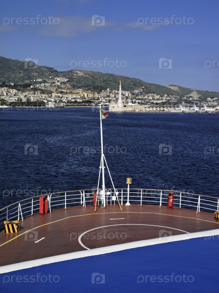 Италия, Сицилия, Мессина, панорамный вид на город и порт с паромной переправы, соединяющей Сицилию с Апеннинским полуостровом и пересекающей Сицилийский канал