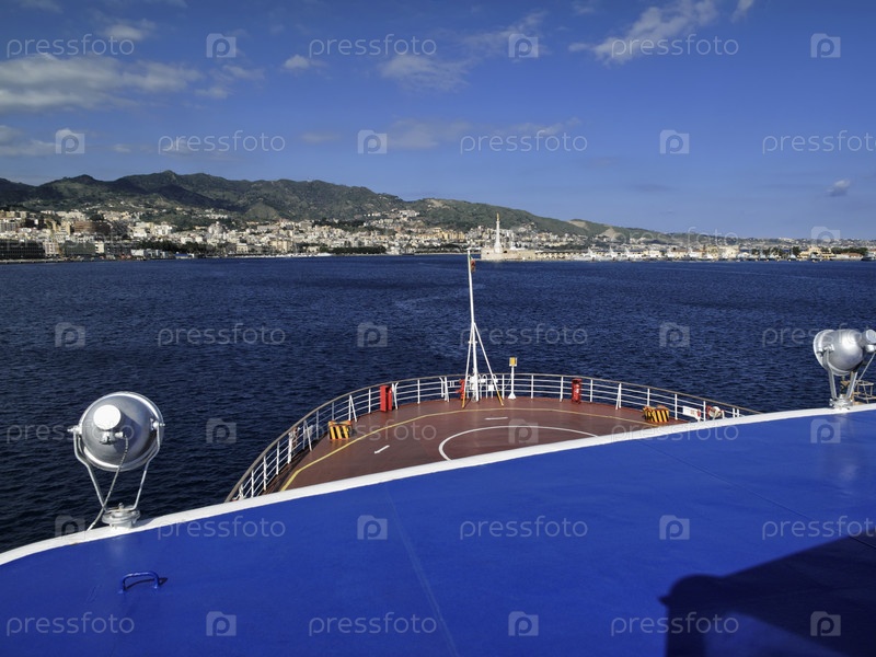 Италия, Сицилия, Мессина, панорамный вид на город и порт с паромной переправы, соединяющей Сицилию с Апеннинским полуостровом и пересекающей Сицилийский канал