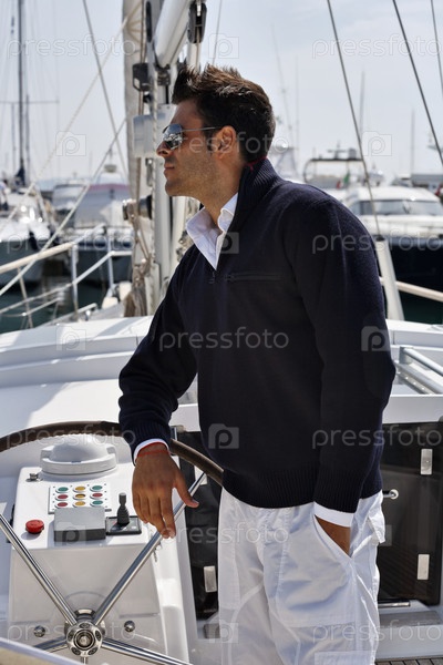 Молодой мужчина в повседневной одежде на парусной лодке. Тоскана, Италия