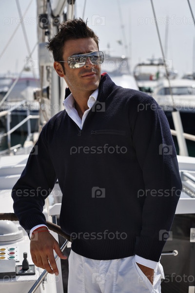 Молодой мужчина в повседневной одежде на парусной лодке. Тоскана, Италия