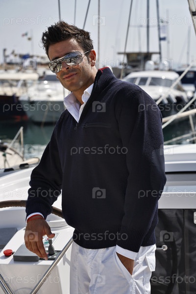 Италия, Тоскана, молодой мужчина-модель в стиле кэжуал на парусной лодке