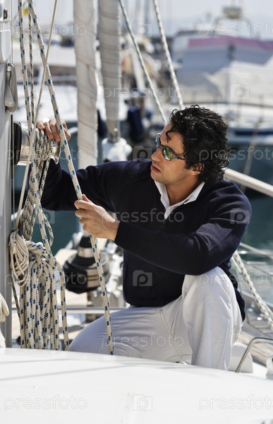 Италия, Тоскана, молодой мужчина-моряк в стиле кэжуал на парусной лодке