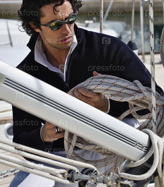 Италия, Тоскана, молодой мужчина-моряк в стиле кэжуал на парусной лодке