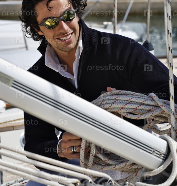 Италия, Тоскана, молодой мужчина-моряк в стиле кэжуал на парусной лодке