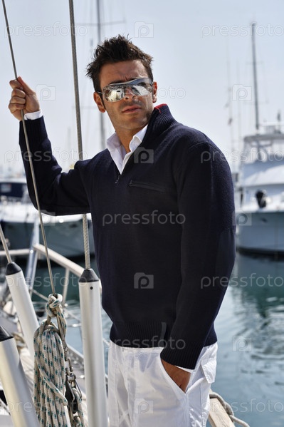 Италия, Тоскана, молодой мужчина-модель в стиле кэжуал на парусной лодке