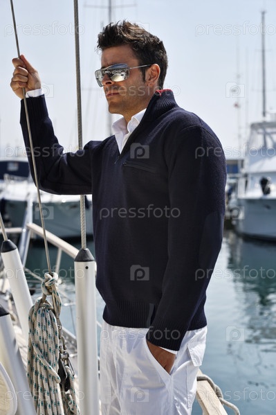 Италия, Тоскана, молодой мужчина-модель в стиле кэжуал на парусной лодке