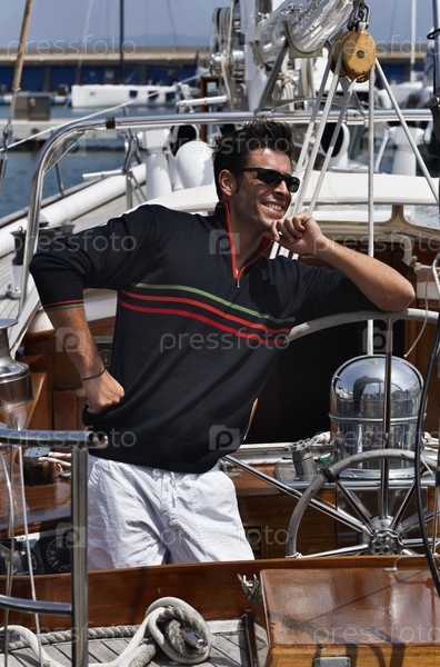 Молодой моряк в повседневной одежде на деревянной палубе лодки. Тоскана, Италия