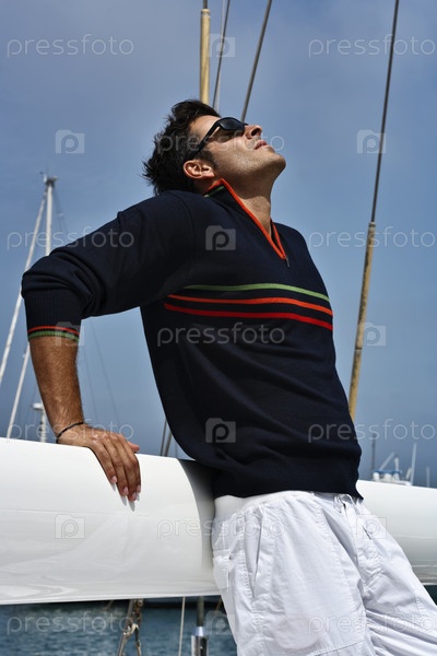 Молодой мужчина в повседневной одежде на парусной лодке. Тоскана, Италия