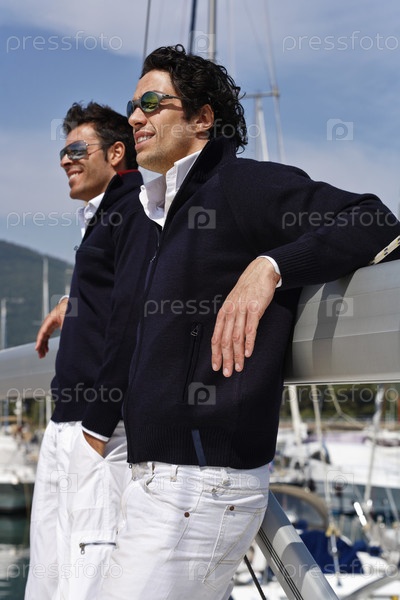Италия, Тоскана, молодые моряки в повседневной одежде на парусной лодке