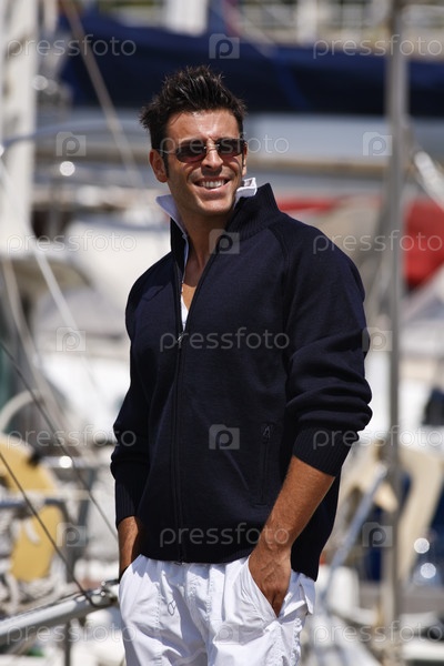 Италия, Тоскана, молодой моряк в повседневной одежде на парусной лодке