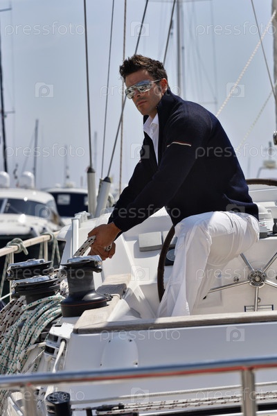 Италия, Тоскана, молодой моряк в повседневной одежде на парусной лодке