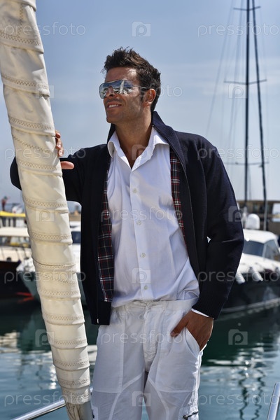 Италия, Тоскана, молодой моряк в повседневной одежде на парусной лодке