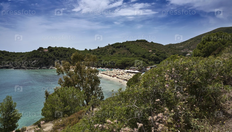 Вид на пляж рядом с Порто Адзурро. Италия, Тоскана, остров Эльба