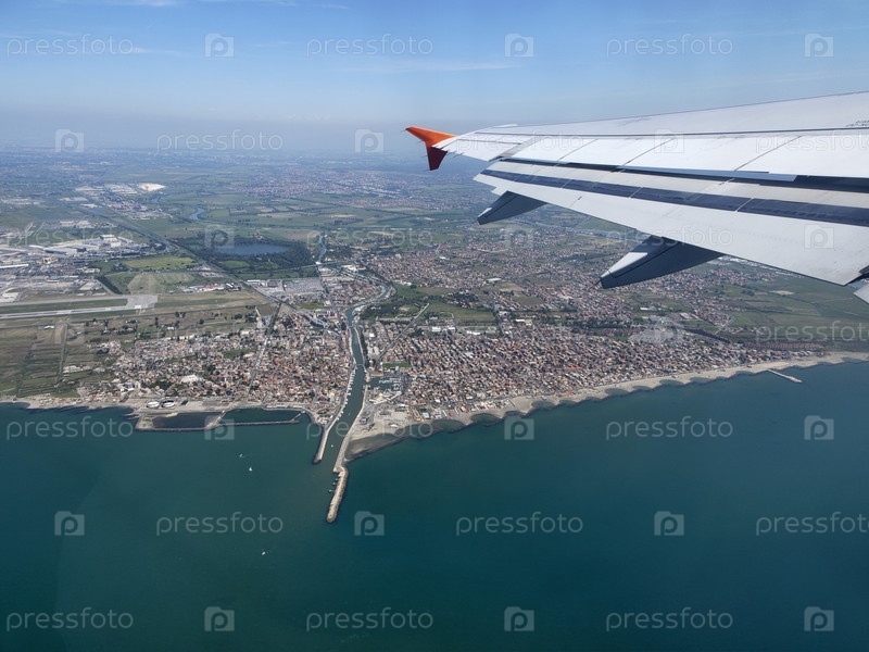 Италия, Лацио, аэрофотоснимок девственного Тирренского побережья и города Фьюмичино (река Тибр слева)
