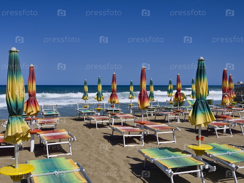 Италия, Сицилия, Ионическое море, Портопало-ди-Капо-Пассеро, шезлонги и зонтики на пляже