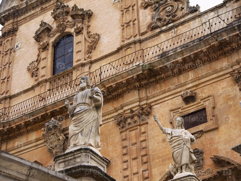 Италия, Сицилия, Модика (провинция Рагуза), собор Святого Петра, фасад в стиле барокко и статуя