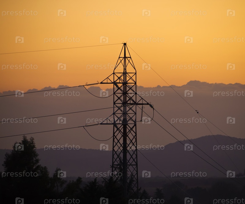 Италия, Лацио, сти, электрические кабели на закате в сельской местности