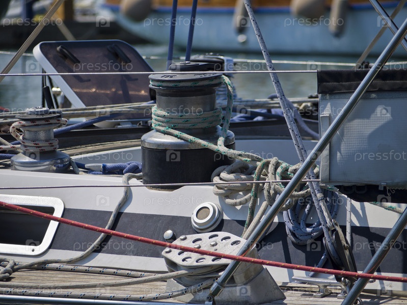 Италия, Сицилия, Средиземное море, парусная лодка в порту с лебедкой и судовым кабелем