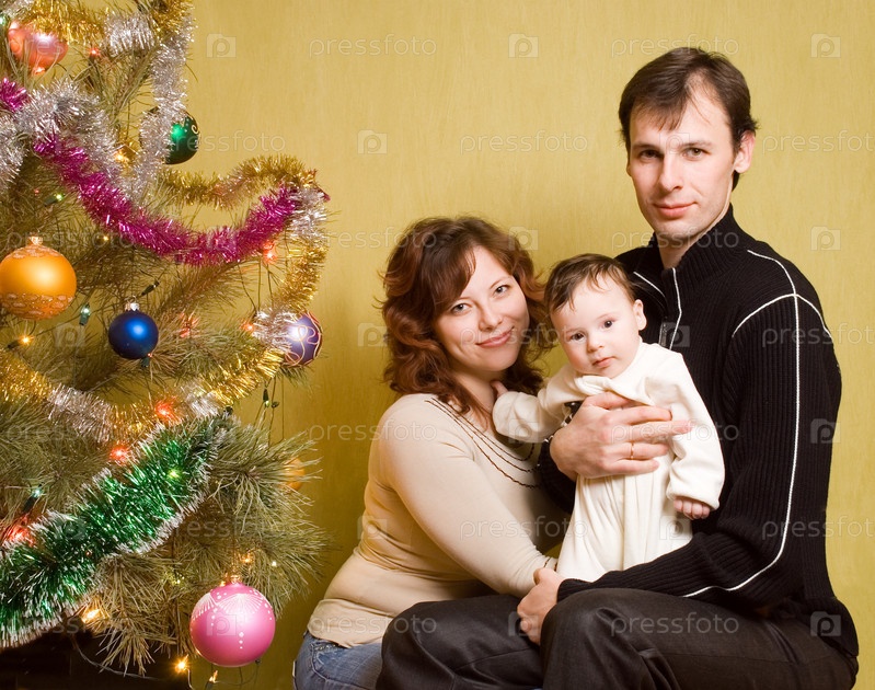 Счастливая семья рядом с новогодней елкой