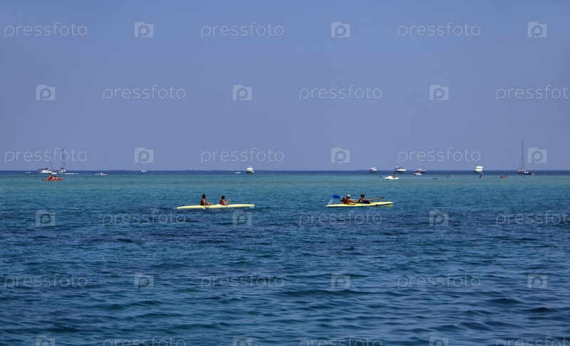 Италия, Сицилия, Средиземное море, Портопало-ди-Капо-Пассеро (провинция Сиракузы), люди на байдарках в прозрачных водах
