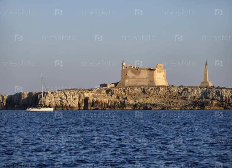 Италия, Сицилия, Портопало-ди-Капо-Пассеро (провинция Сиракузы), вид на остров Капо-Пассеро и древний испанский форт