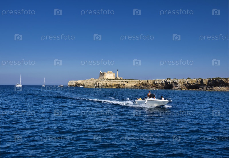 Италия, Сицилия, Портопало-ди-Капо-Пассеро (провинция Сиракузы), вид на остров Капо-Пассеро и древний испанский форт