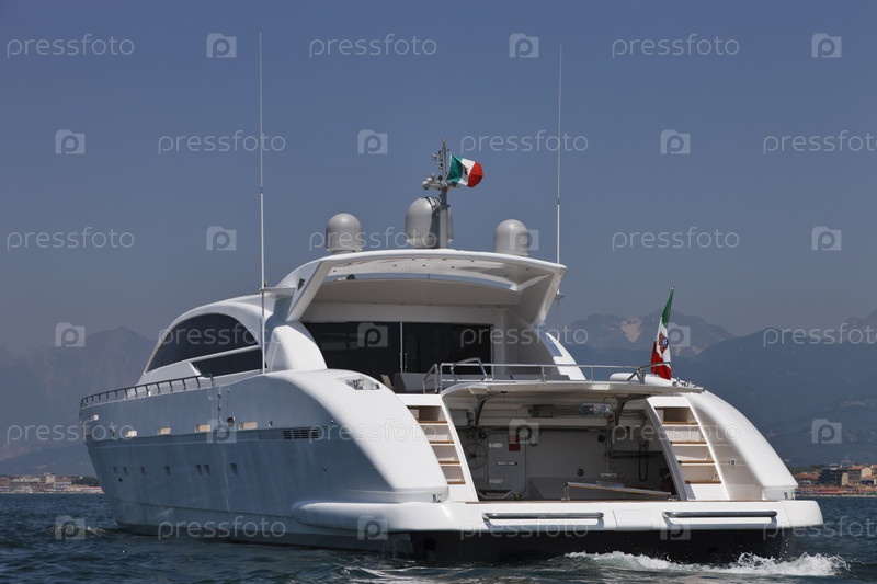 Италия, Тирренское море у побережья Виареджио, Тоскана, роскошная яхта Текномар 36 (36 метров), корма и место для хранения надувной лодки