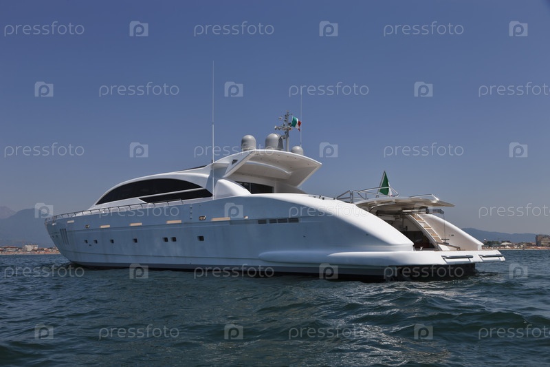 Италия, Тирренское море у побережья Виареджио, Тоскана, роскошная яхта Текномар 36 (36 метров), корма и место для хранения надувной лодки