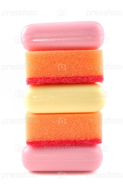 Мыло и поролоновые губки на белом фоне