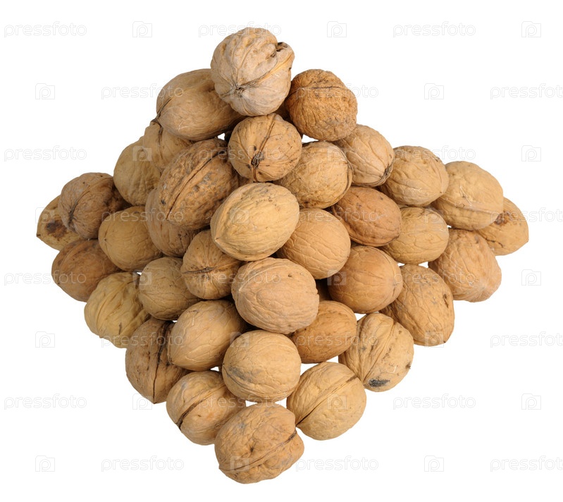 Пирамида из грецких орехов на белом фоне