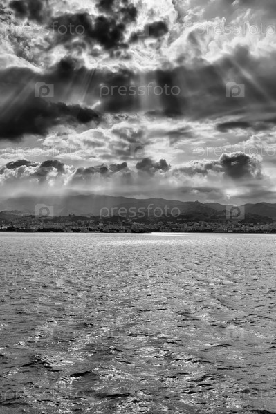 Италия, Сицилия, Мессина и побережье Сицилии с Сицилийского канала в пасмурный день