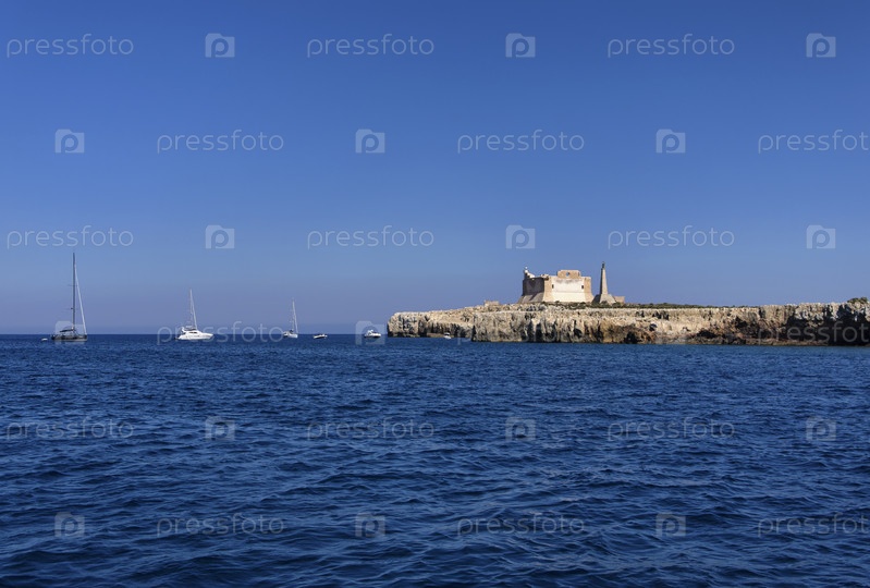 Италия, Сицилия, Портопало ди Капо-Пассеро (провинция Сиракуза), вид на остров Капо-Пассеро и его древний испанский Форт