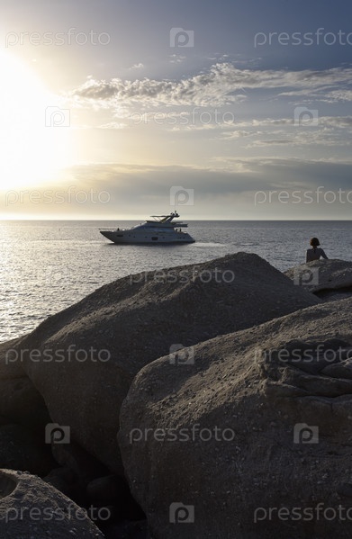 Италия, Тоскана, остров Эльба, женщина на скалах и роскошная яхта Азимут 75'