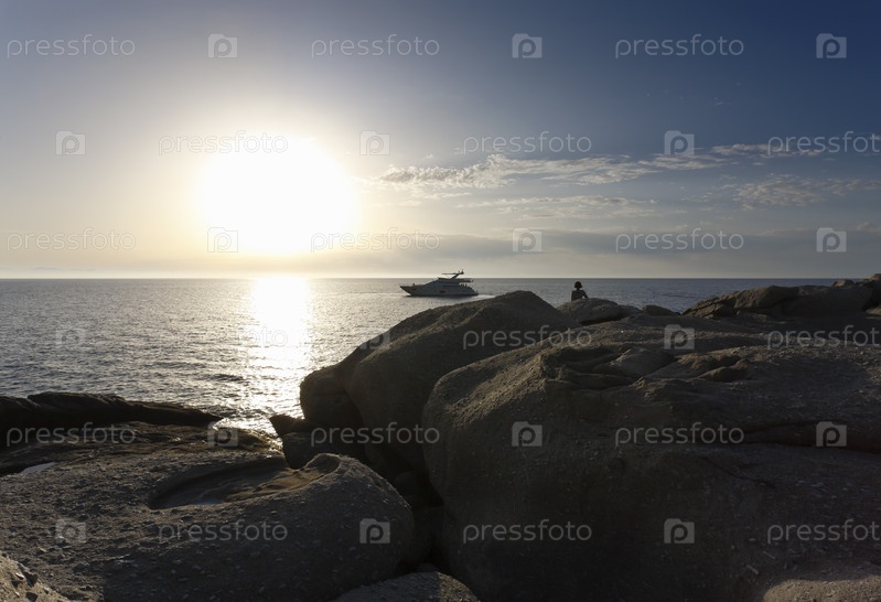 Италия, Тоскана, остров Эльба, женщина на скалах и роскошная яхта Азимут 75'