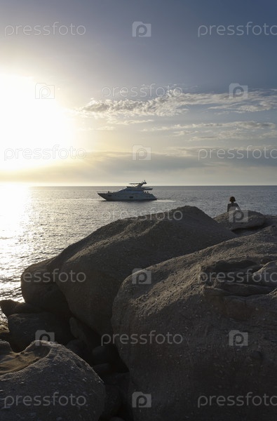 Италия, Тоскана, остров Эльба, женщина на скалах и роскошная яхта Азимут 75'
