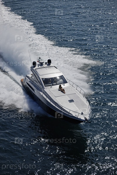 Италия, Лацио, Тирренское море, аэрофотосъемка роскошной яхты Alfamarine 60', покидающей побережье Фьюмичино (Рим)