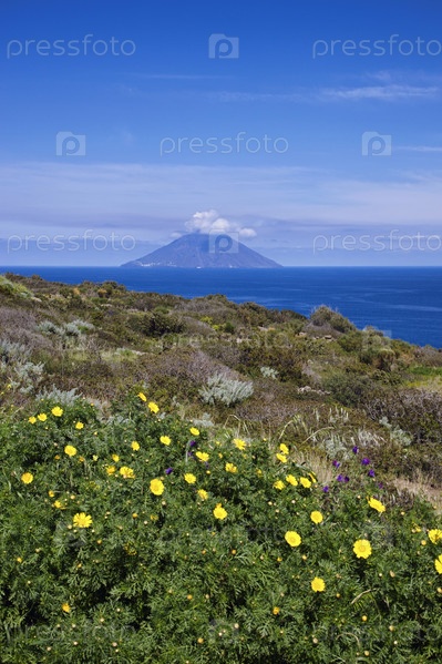 Италия, Сицилия, Тирренское море, Эолийские острова, вид на вулкан Стромболи на острове Панарея