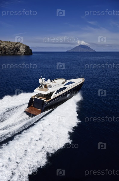 Италия, Сицилия, остров Панарез, остров Стромболи на заднем плане, аэрофотоснимок роскошной яхты Абакус 70' с верфи Абакус