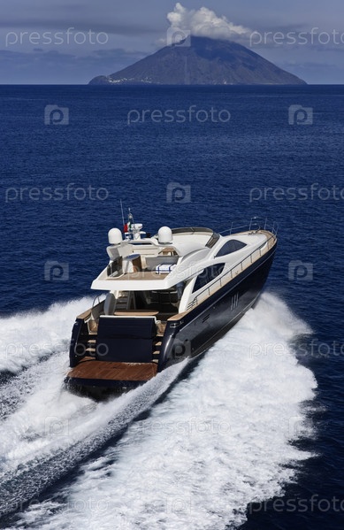 Италия, Сицилия, остров Панарез, остров Стромболи на заднем плане, аэрофотоснимок роскошной яхты Абакус 70' с верфи Абакус