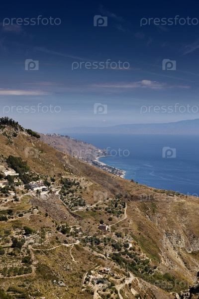 Италия, Сицилия, Кастельмола (Таормина), восточное скалистое побережье Сицилии и Ионического моря, Калабрия далеко на заднем плане