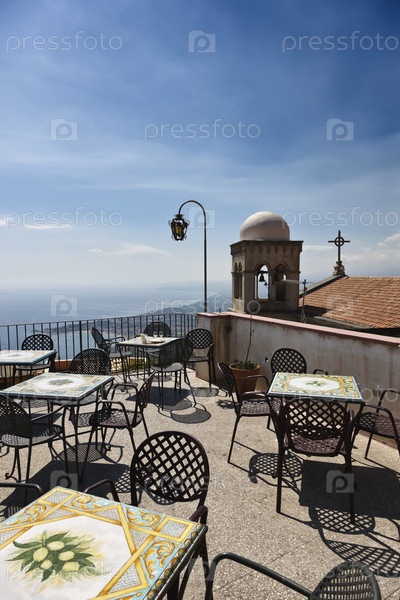 Италия, Сицилия, Кастельмола (Таормина), колокольня собора и восточное побережье Сицилии. Терраса с баром