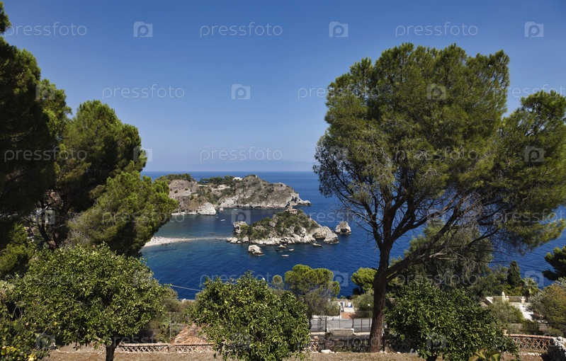 Италия, Сицилия, залив Таормина, вид Капо Таормина и Изола Белла, побережье Калабрии на заднем плане