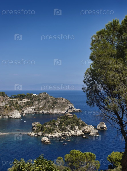 Италия, Сицилия, залив Таормина, вид Капо Таормина и Изола Белла, побережье Калабрии на заднем плане